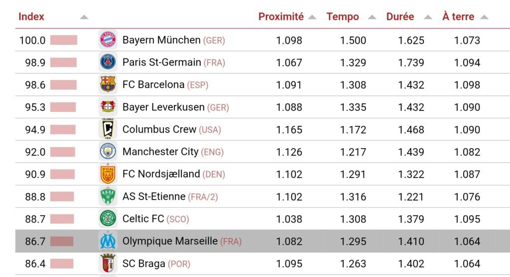 La plus grosse surprise de ce classement est sans aucun doute la 8ème place de l’AS Saint-Etienne, qui, sur le plan des résultats, réalise une première partie de saison compliquée. Les Verts sont devant l’OM de De Zerbi, qui pointe quand même à une très bonne 10ème place. A noter que l’on ne trouve pas dans le Top 10, Arsenal (pas réputé pour la qualité de son jeu), le Real Madrid (en difficulté cette saison), ni aucun club Italien. Rappelons toutefois qu’il n’est pas obligatoire de « bien jouer » pour avoir des résultats, comme le prouve Arsenal, leader de la phase de championnat de la Ligue des Champions et absent ici.